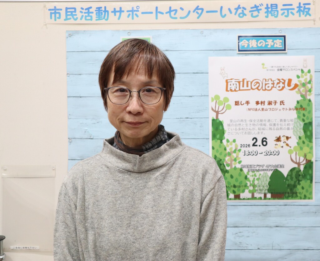 今回の金曜サロンスペシャルは「南山のはなし」と題して、里山の再生・保全活動を通して、貴重な稲城の自然と生き物の情報、保護を伝え続けている、NPO法人里山プロジェクトみなみ代表の多村さんに、稲城に残る自然の豊かさについてお話しいただきました。