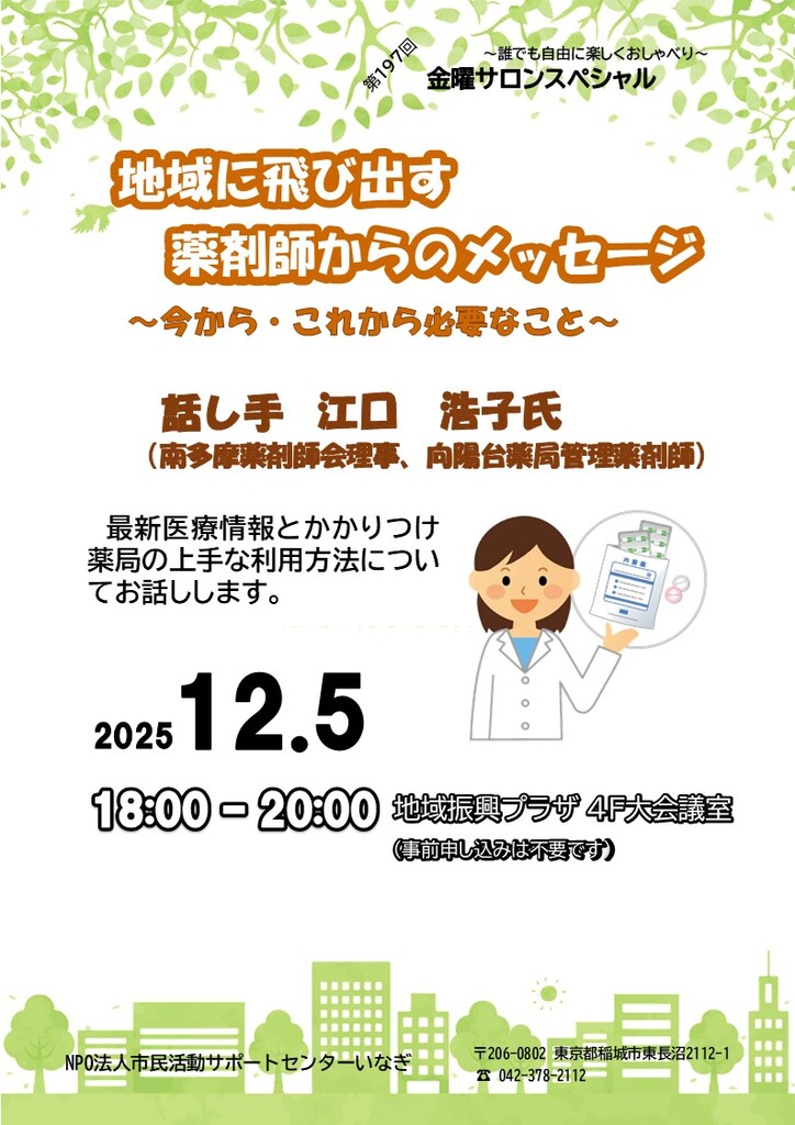 12月の金曜サロンスペシャル 『地域に飛び出す薬剤師からのメッセージ ~今から・これから必要なこと~』 話し手 江口浩子氏 12月5日18時より 地域振興プラザ4階 2025.11.08 - サポセン情報, 最新情報 ☆事前申し込みは不要です 是非ご参加ください! 第196回 金曜サロンスペシャル『フードドライブって何?効果は?』ニュースレターNo.79 新着記事 NPO法人はらっぱの会 第196回 金曜サロンスペシャ... 12月の金曜サロンスペシャル ... 【東京ボランティア・市民活動セ... ニュースレターNo.79 【独立行政法人 国立青少年教育... 【稲城市国際交流委託事業】第5... 第195回 金曜サロンスペシャ... 【支え合う会 みのり】会報誌 ... 第194回 金曜サロンスペシャ... カテゴリー サポセン情報 ブログ NPO講座 市民活動支援講座 行政協働企画講座 金曜サロンスペシャル 助成金情報 団体情報 最新情報 月別アーカイブ 2025年 11月 10月 9月 8月 6月 5月 4月 3月 2月 1月 2024年 12月 11月 10月 9月 8月 7月 6月 5月 4月 3月 2月 1月 2023年 12月 11月 10月 9月 8月 7月 6月 5月 4月 3月 2月 2022年 12月 11月 10月 9月 8月 7月 6月 5月 4月 3月 2月 1月 2021年 12月 11月 10月 9月 7月 6月 4月 3月 2月 1月 2020年 12月 11月 10月 9月 8月 7月 3月 2月 1月 2019年 12月 11月 10月 9月 7月 6月 4月 3月 2月 1月 2018年 12月 11月 10月 9月 7月 6月 4月 3月 2月 1月 2017年 12月 11月 10月 9月 7月 6月 5月 3月 2月 1月 2016年 12月 11月 10月 9月 7月 6月 5月 3月 2月 1月 2015年 12月 11月 10月 9月 7月 6月 4月 3月 2月 1月 2014年 12月 11月 10月 7月 6月 5月 4月 3月 1月 2013年 11月 10月 8月 2月 2012年 11月 9月 2月 2011年 7月 2月 2010年 12月 10月 8月 6月 4月 2月 2009年 12月 10月 8月 6月 4月 2月 2008年 12月 10月 8月 6月 4月 2月 2007年 12月 10月 8月 6月 4月 2月 2006年 12月 10月 8月 6月 4月 2月 2005年 12月 10月 8月 6月 4月