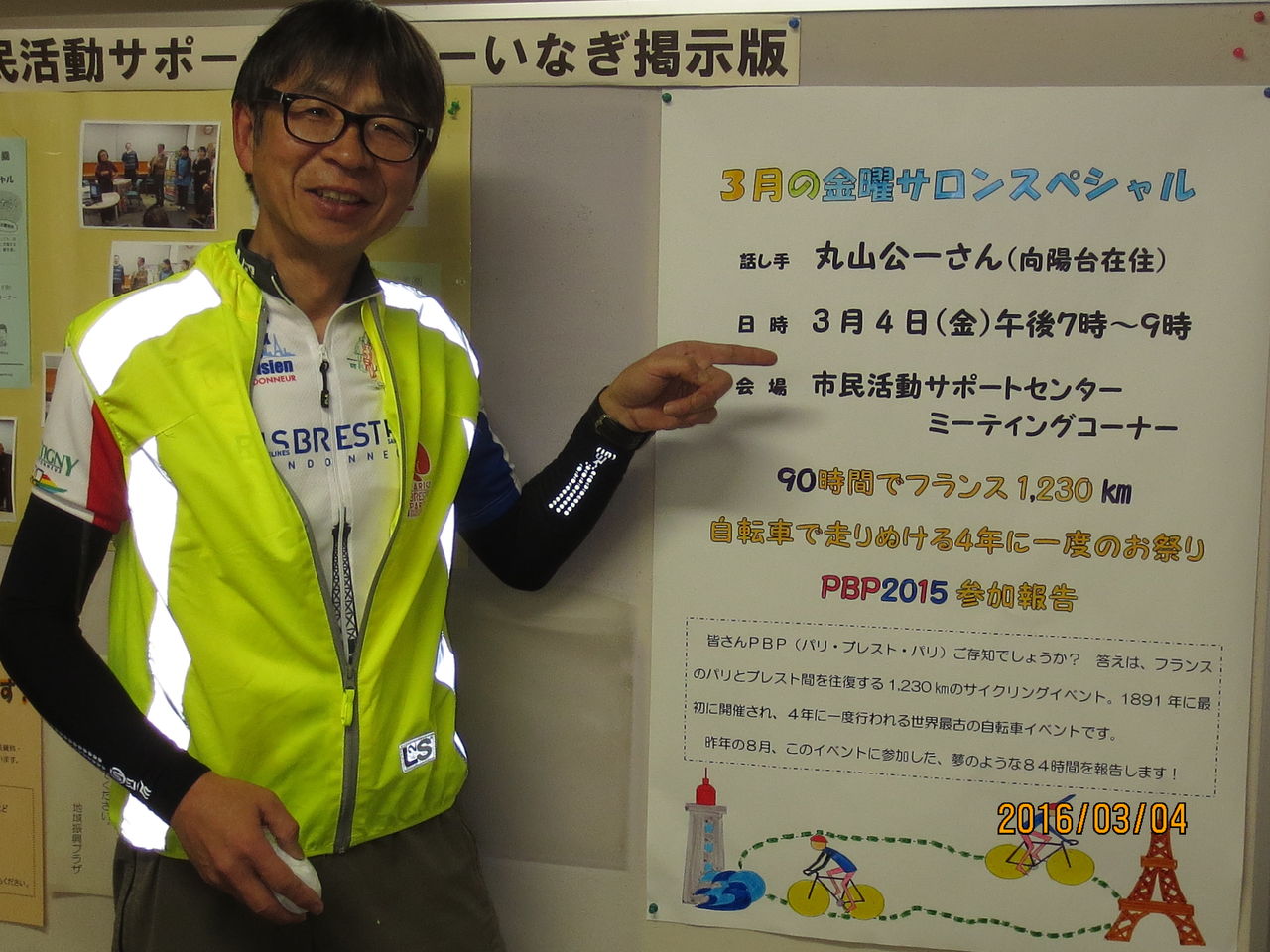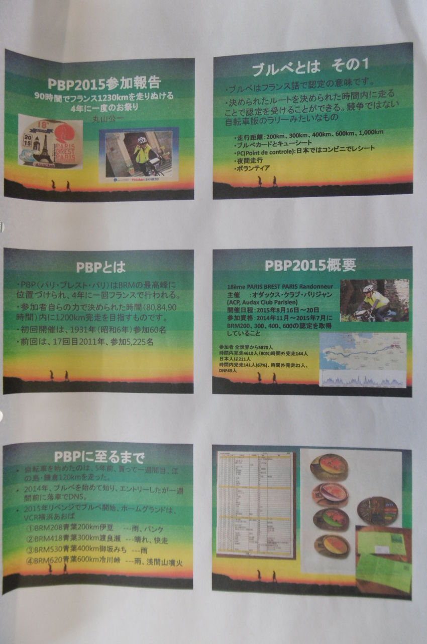 平成27年度最後の金曜サロンスペシャルは丸山公一さん(向陽台在住)によるPBP2015参加報告です。