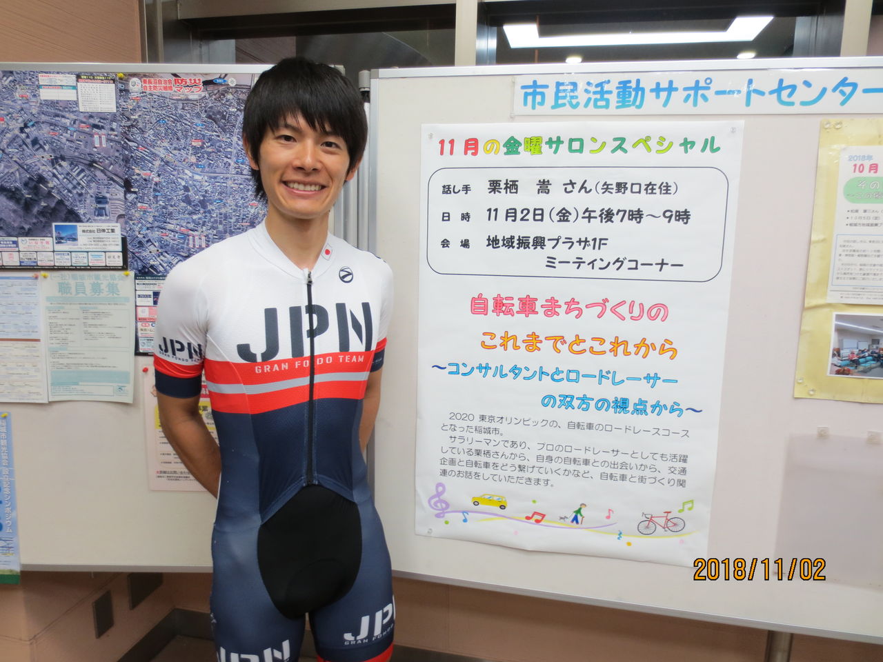 今月の金曜サロンスペシャルは、矢野口に在住の栗栖 嵩さんが「自転車まちづくりのこれまでとこれから」と題し、コンサルタントとロードレーサーの双方の視点から、交通企画と自転車、自転車と街づくり関連などのお話をしていただきました。