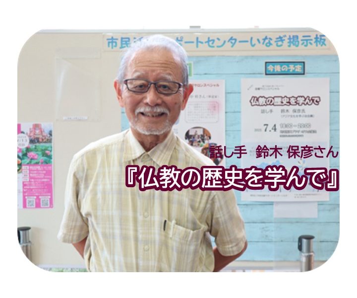 今回の金曜サロンスペシャルは、「仏教の歴史を学んで」と題して、アジア文化を学ぶ会・会員の鈴木さんが、インドに始まり日本に伝来し、日本の政治、文学、美術その他、諸々の分野に影響を与えてきた仏教の歴史について、ご自分が学んできた「仏教の歴史」のおさらいをするという趣向でお話をされました。